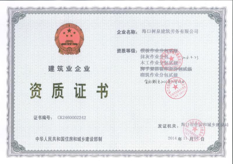 海口樹泉建筑勞務有限公司成立于2011年,公司位于海口,其前身是一家專業建筑施工隊,自2004年即開始在海南從事建筑勞務施工。自成立至今,公司已經擁有一支科學管理、質量過硬、能打硬仗,搶工期的專業隊伍。能獨立承擔大中型工業與民用建筑 、室內外裝修、各類機電設備安裝工程。代表工程有海口濱海華庭、三亞時代海岸T01/02/04/05棟高層、合肥東海花園二期、陵水富力灣B區高層、三亞金中海(酒店)、瓊海大印經典花園、海口環球海景大酒店(四星級酒店,在建中)、陵水珍珠大廈(五星酒店)、海口萬達廣場、美蘭機場二期。